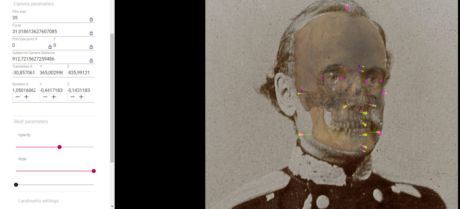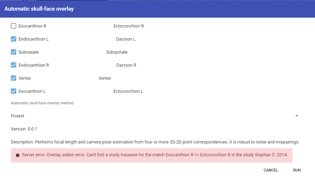 The POSEST-SFO automatic skull-face overlap algorithm estimates the camera parameters, from the coordinates of a set of pairs of cephalometric-craniometric landmarks and the corresponding soft tissue study (see Section POSEST-SFO automatic skull-face overlap).