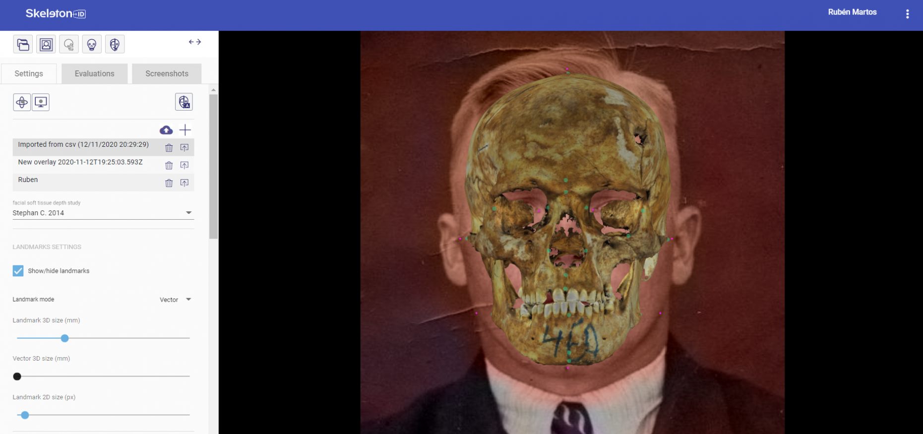 Figure 3. A screenshot of Skeleton·ID showing a 3D skull with craniometric landmarks (green points) and soft-tissue vectors (blue arrows) pointing towards the corresponding facial landmarks.